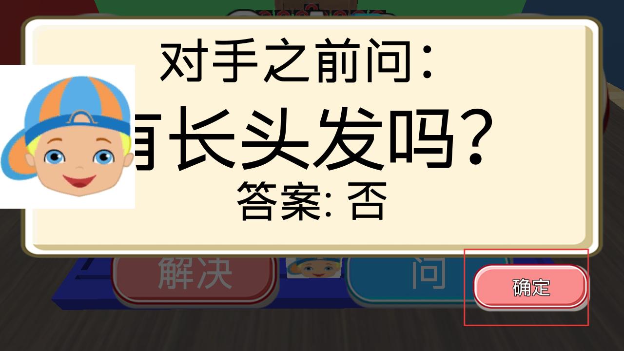 2、游戏中会出现对手提问的界面,比如问有长头发吗,需查看答案,然后点击确定,推进游戏进程。