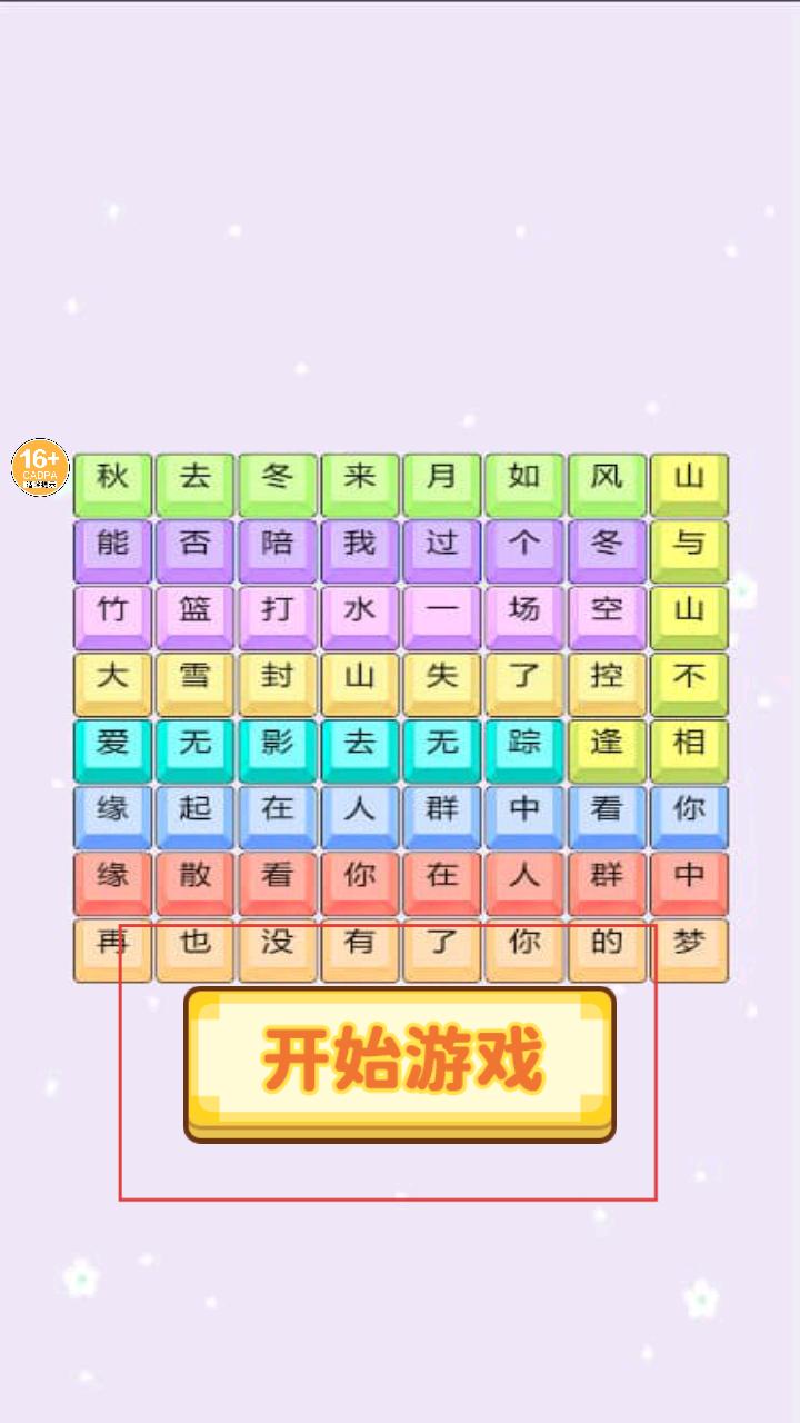 1、进入游戏,看到布满文字的界面,下方有开始游戏按钮,点击它就能开启文字解谜挑战。