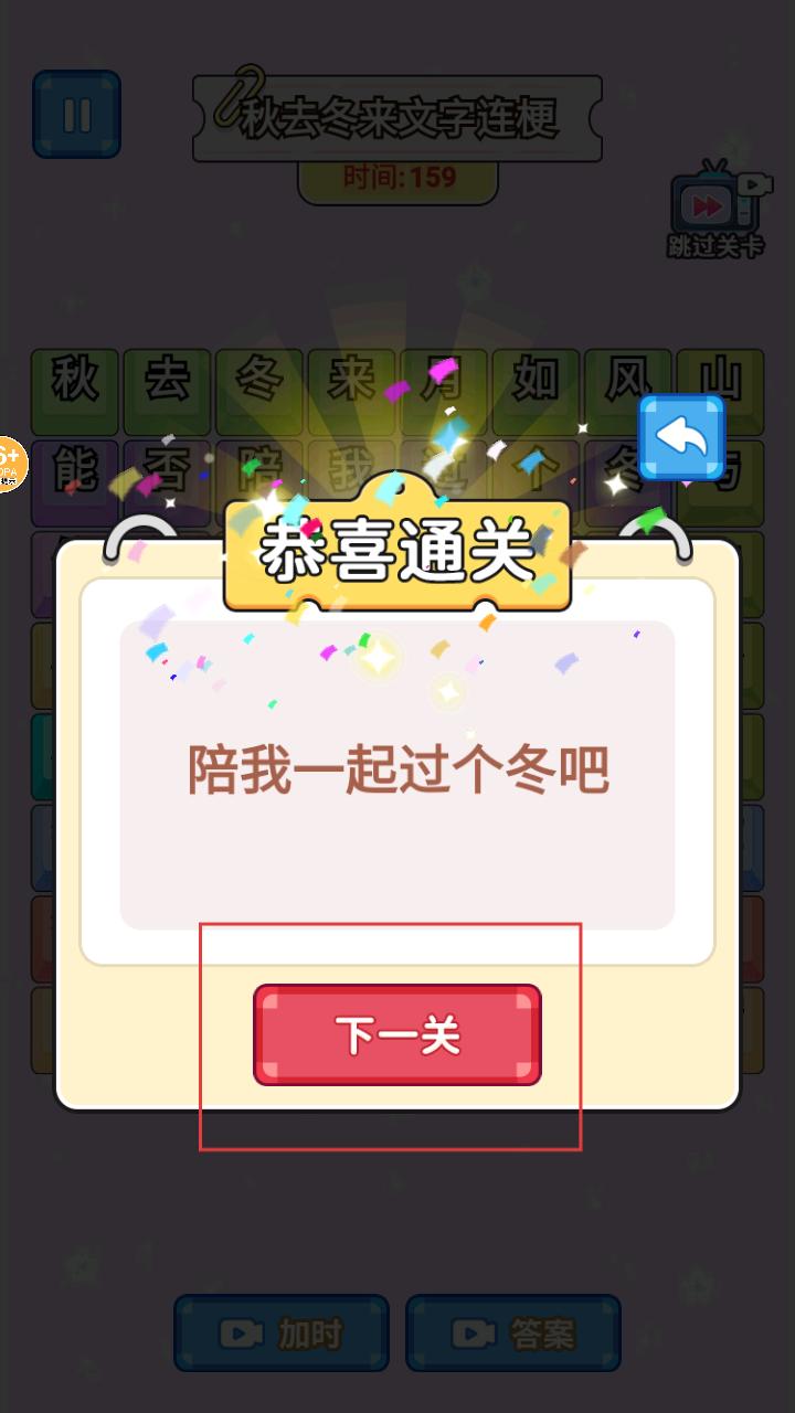 4、成功通关后,会显示恭喜通关界面,还有下一关按钮,点击可继续挑战新的文字解谜关卡。