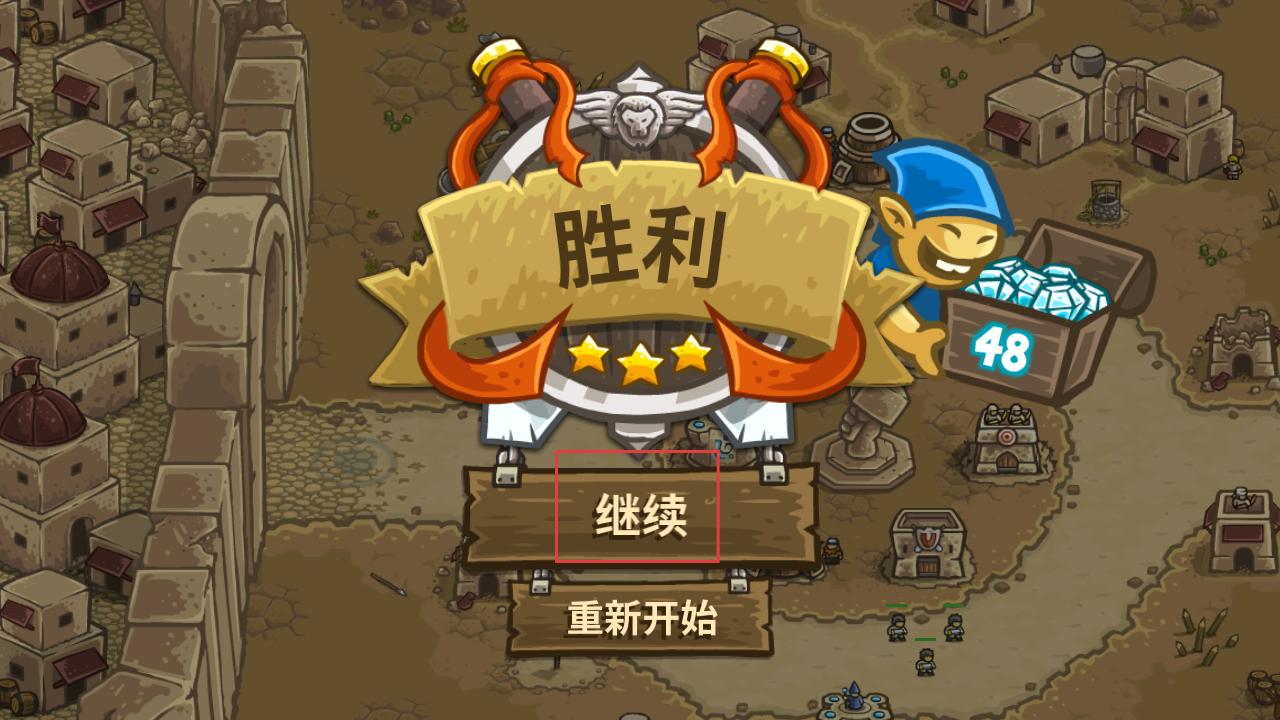 4、成功抵御敌人进攻后,会显示胜利界面,获得奖励,点击继续按钮,可开启下一场塔防挑战。