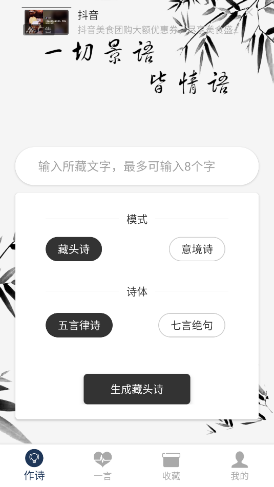 1、进入软件,可在这里输入8个文字,点击藏头诗,选择诗体,点击生成藏头诗。