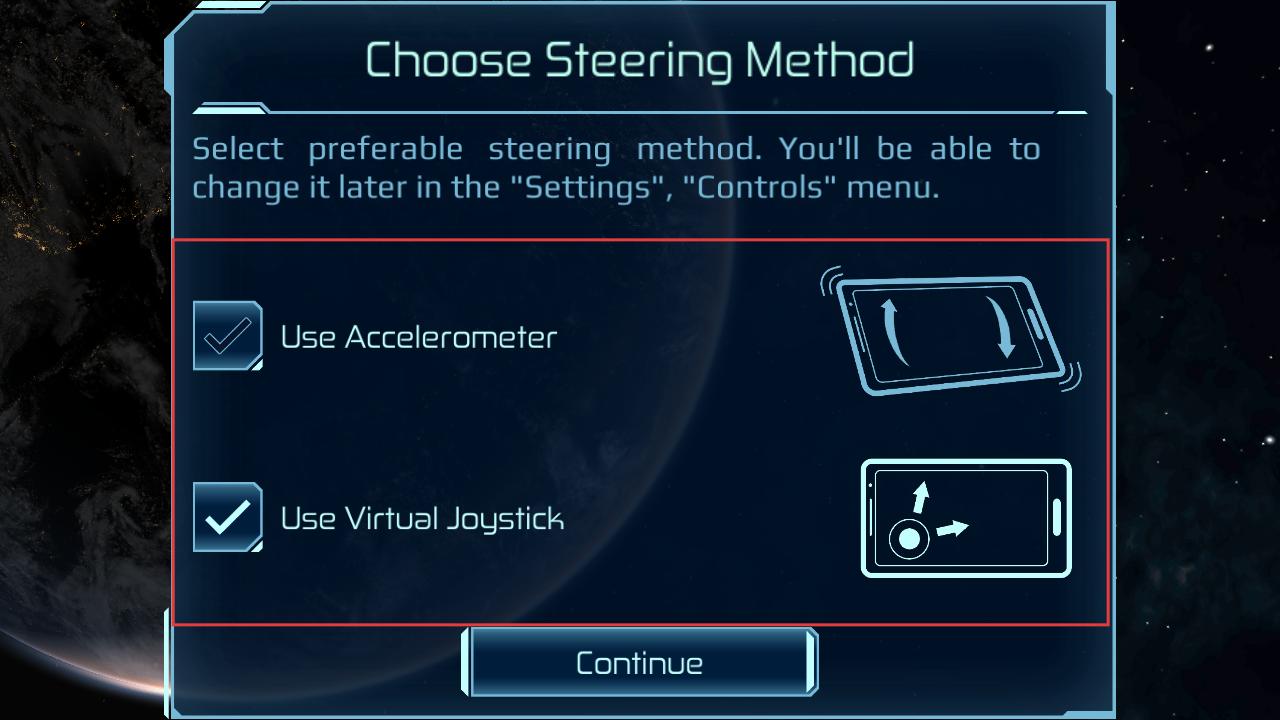 2、接着会进入操作选择界面,能选Use Accelerometer或Use Virtual Joystick来操控飞船,选好后点击Continue继续。