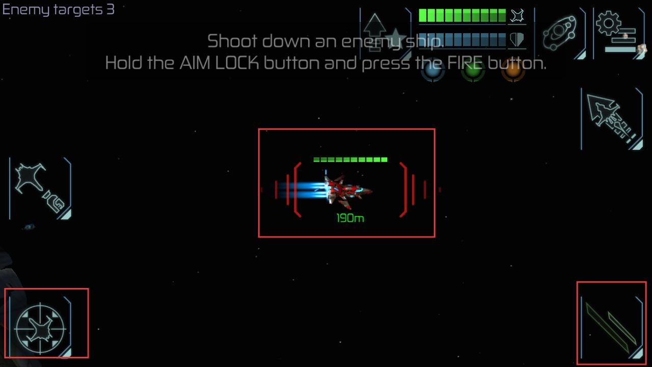 4、遇到敌方飞船时,按住AIM LOCK按钮锁定目标,再按下FIRE按钮发射武器,击落敌方飞船完成战斗任务。