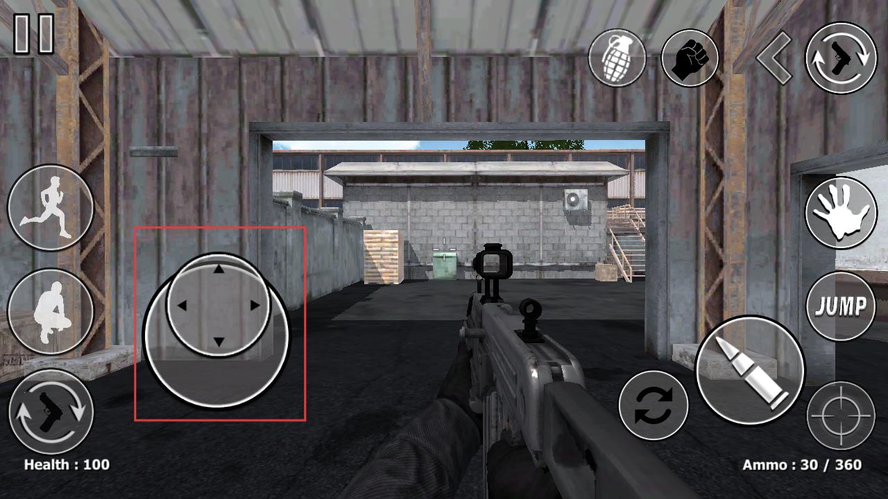 2、在场景中通过左侧虚拟摇杆控制角色移动,探索不同区域,寻找僵尸并准备战斗。