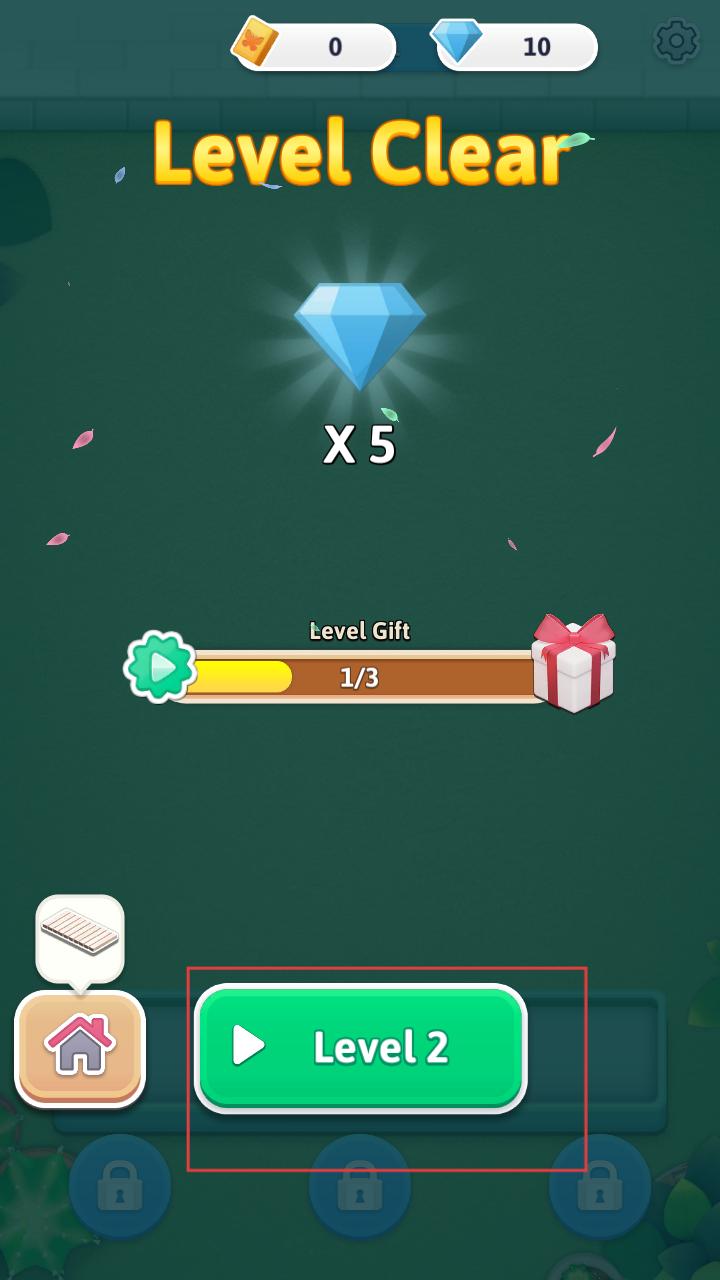 4、成功通关后,会显示Level Clear界面,可获得钻石等奖励,点击Level2,继续下一关挑战。
