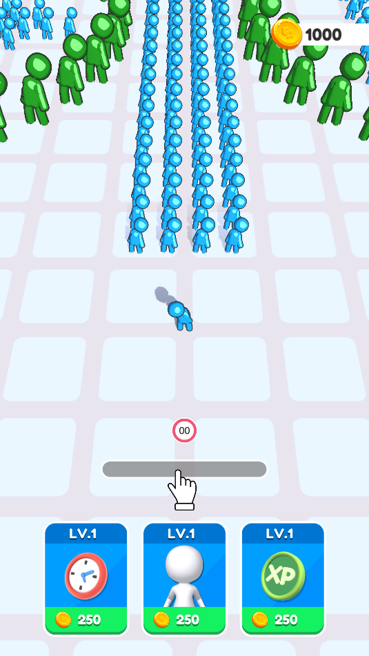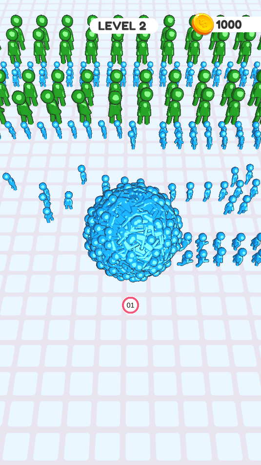 1、进入游戏,点击按住屏幕滑动,控制小蓝人向人群移动,把其他小蓝人合并在一起,变成一个大球。