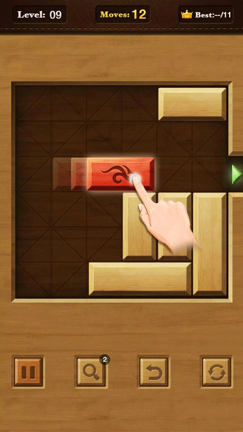 2、滑动木块,移动非红色木块腾出路径,将红木移出指定区域通关。