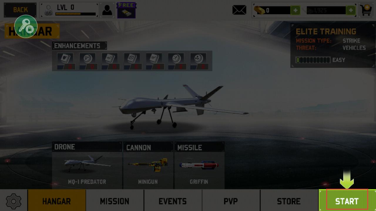 2、在机库界面点击开始按钮,驾驶MQ1捕食者无人机,开启定制化的空战任务。