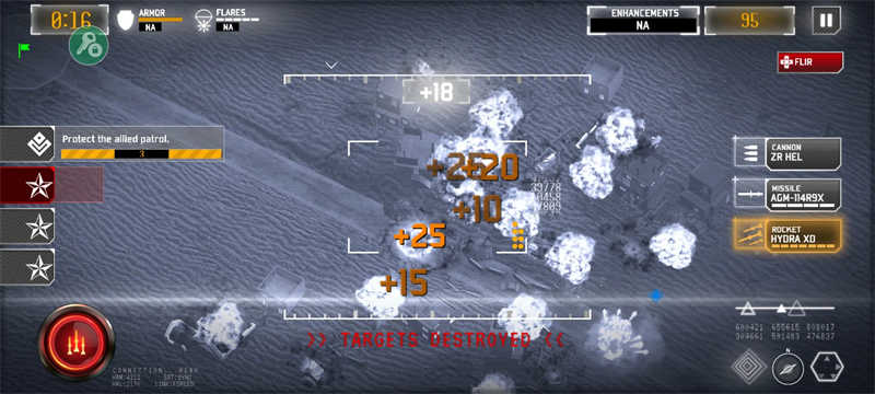 4、使用加特林机炮摧毁目标,获得分数奖励,推进任务进程,感受真实的空战打击体验。