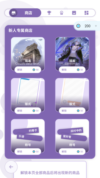 4、收藏品收集:用游戏货币兑换插画、称号与版式,自定义主界面风格,满足收集欲。