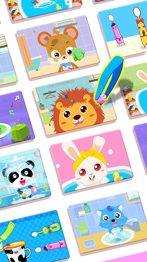1、清洁模拟核心,还原刷牙、洗脸、洗头等流程,挤泡沫、揉洗、冲洗步骤清晰,完成后角色会做出开心反应,传递清洁的意义与方法。