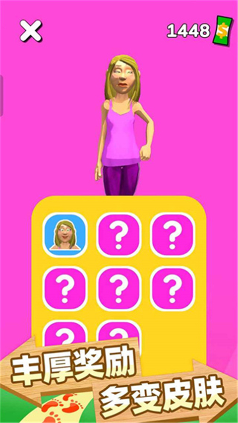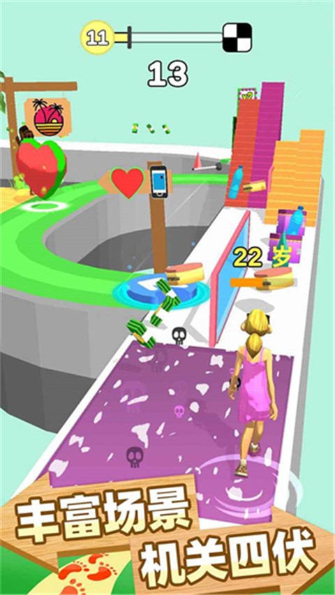 1、点击屏幕开启游戏,操控年轻人形象在跑酷场景中前进,途中主动收取健身物品、护肤品等道具,让形象保持年轻状态。