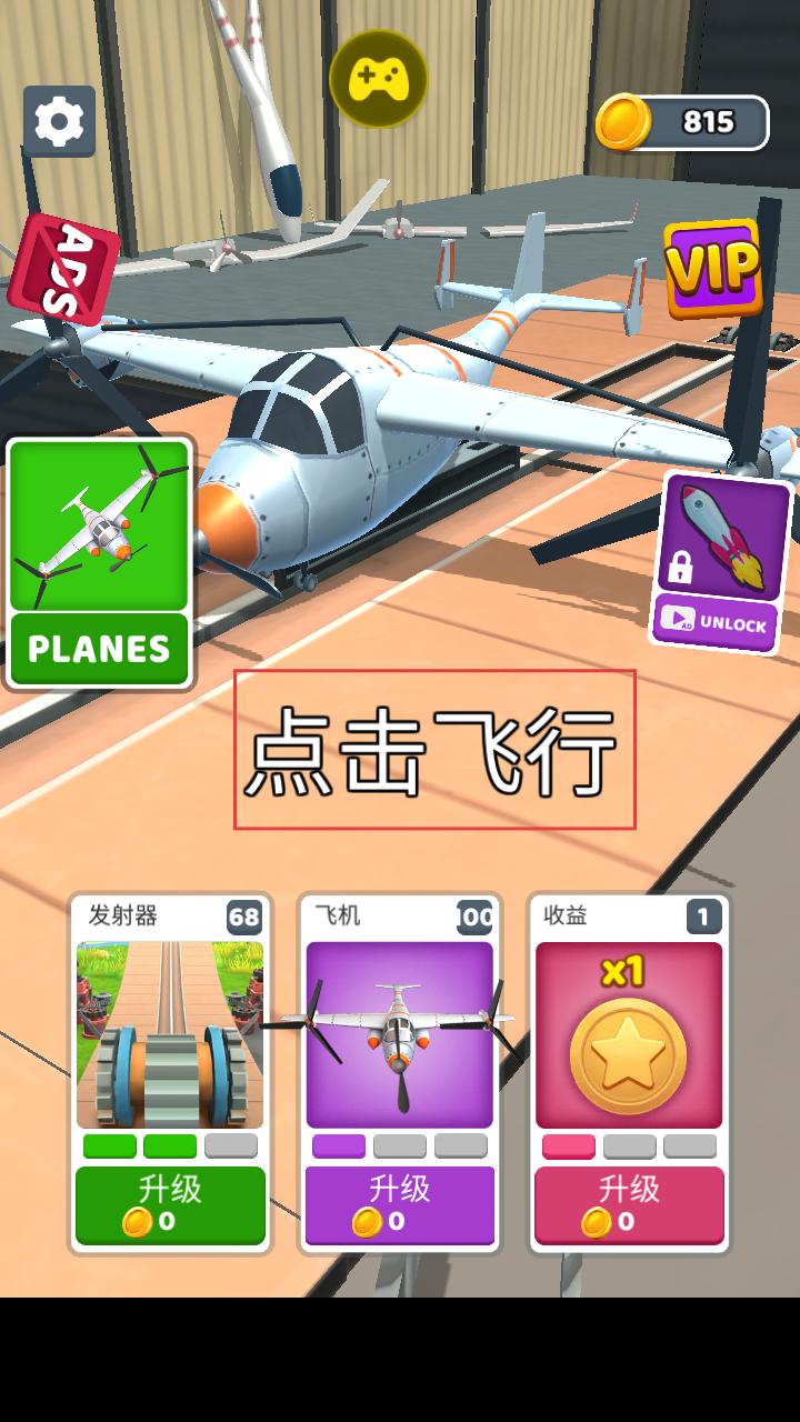 1、进入游戏看到点击飞行提示,可升级发射器、飞机、收益模块,开启飞行模拟之旅,准备体验真实飞行的挑战与乐趣。