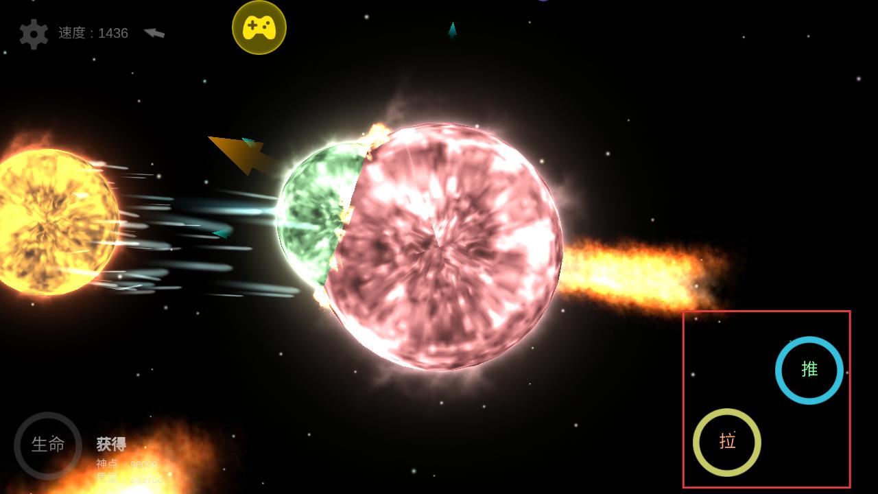 2、利用推、拉按钮操控恒星移动,碰撞其他天体,吸收质量提升等级,体验直观的物理操控感。
