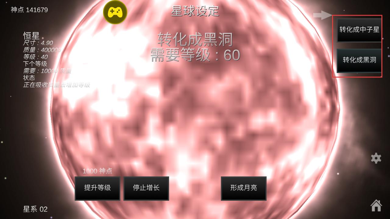 3、在星球设定界面,当等级满足要求时,可选择转化成中子星或黑洞,开启更高阶段的宇宙进化之旅。