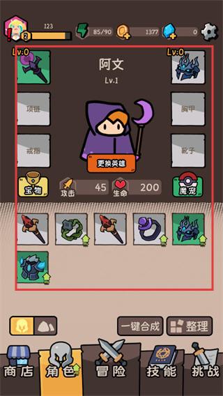 1、在角色界面可更换英雄,查看英雄攻击、生命属性,搭配装备、宠物、宝物,为闯关战斗做好战力准备。