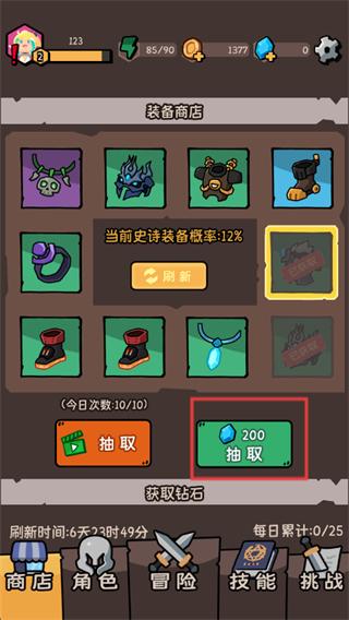 2、进入装备商店,可花费钻石或免费抽取装备,提升史诗装备概率,获取强力装备助力闯关。