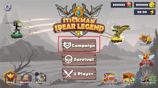 1、进入游戏主界面,选择Campaign模式,开启剧情冒险之旅,可体验动作对战与竞技玩法,开启火柴人长矛战斗的精彩征程。