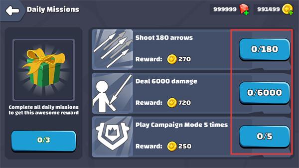 2、查看Daily Missions,完成射击180支箭、造成6000伤害、玩5次战役模式等任务,获取金币奖励,助力角色成长与装备提升。