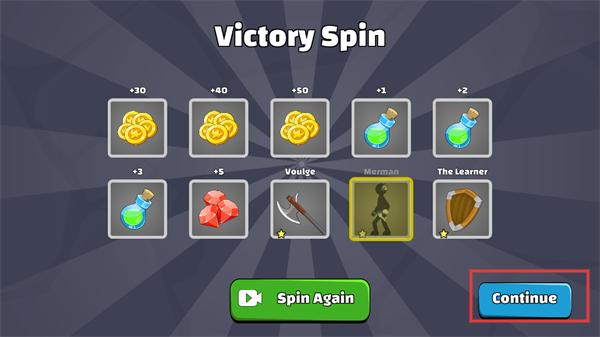 4、战斗胜利后参与Victory Spin,有机会获取金币、道具等奖励,点击Continue继续挑战或领取奖励,不断提升战力,畅享战斗爽快感。