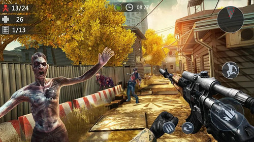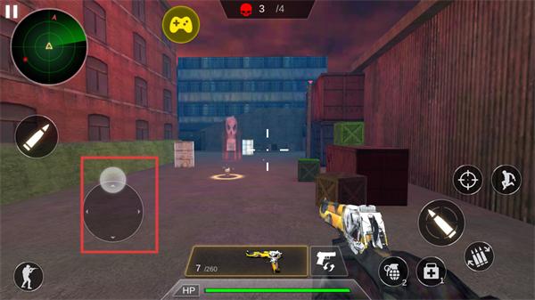 2、战斗中通过左侧虚拟摇杆移动,瞄准僵尸射击,在城市废墟场景中灵活走位,消灭来袭的僵尸,保障自身生存。