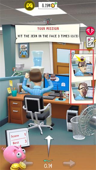 4、击中同事脸部后,同事和办公环境出现搞怪污渍效果,完成任务,体验同事从正常到狼狈的情绪变化,享受在办公室恶作剧的休闲乐趣。