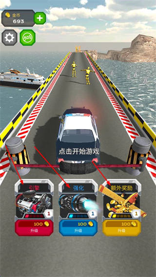 1、赛前用金币升级引擎、强化、额外奖励模块,提升汽车属性,点击开始游戏进入水上赛道挑战。