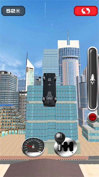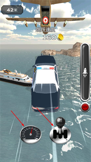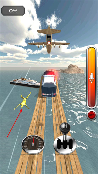 2、游戏关卡内操控速度表和换挡杆行驶,躲避或撞击人偶,遇飞机障碍灵活应对,善用火箭加速道具。