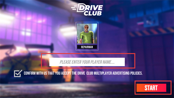 1、进入游戏先在输入框填写玩家名字,勾选同意广告政策后点击START,开启赛车竞速之旅。