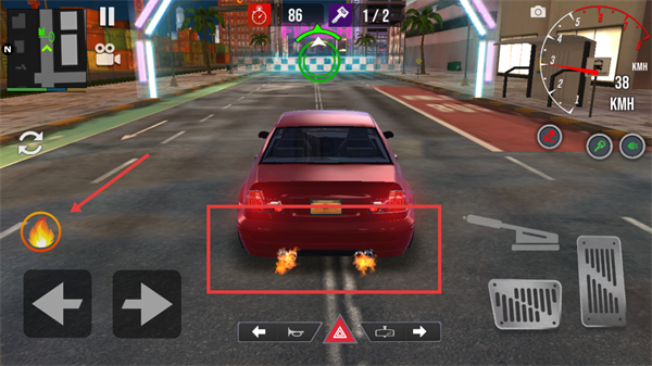 3、比赛中点击左侧氮气按钮,车辆尾部喷出火焰加速,提升行驶速度,全力冲向赛道终点。