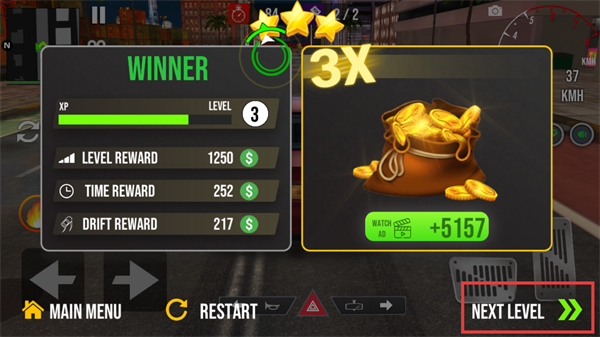 4、比赛胜利后获得金币、经验等奖励,点击NEXT LEVEL进入下一关,继续参与更具挑战的赛车竞速。