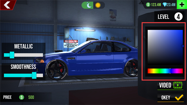 1、在车辆自定义界面,调整METALLIC、SMOOTHNESS滑块并选择颜色,花费500金币点击OKEY,完成车辆外观改装,打造专属个性化赛车。