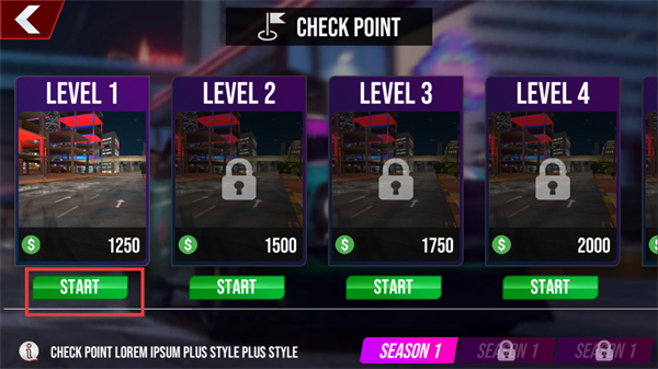 3、进入CHECK POINT模式关卡选择界面,点击LEVEL1的START按钮,花费1250金币,开启第一关的检查点竞速任务。