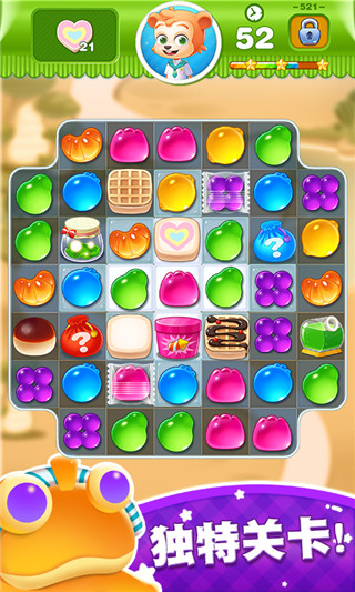 3、场景探索系统,通关指定关卡解锁新场景,每个场景有专属剧情与特色糖果,如巧克力城堡的熔岩糖果,探索进度推动故事发展。