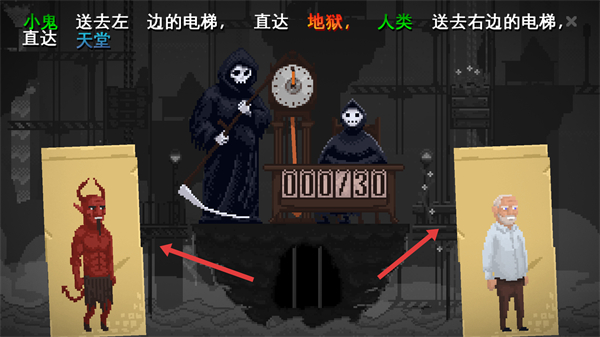 4、区分小鬼和人类灵魂,将小鬼送往左边电梯直达地狱,人类送往右边电梯直达天堂,完成对应分配。