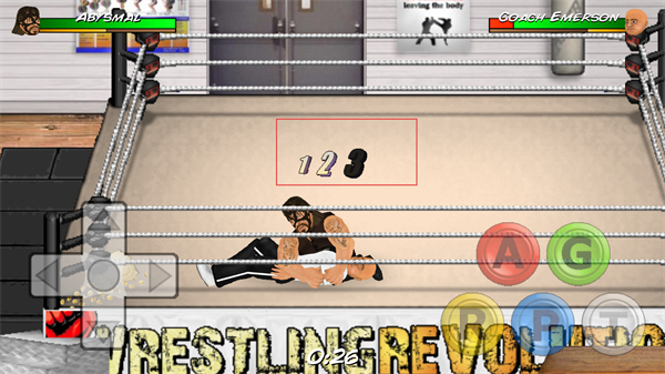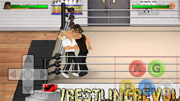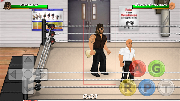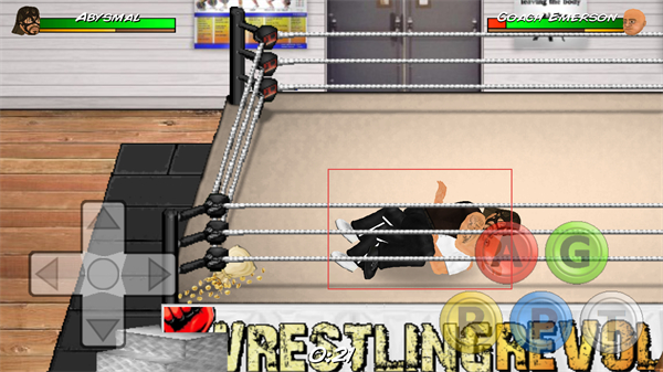 2、点击攻击类按键,让角色发动近身抱摔动作,将对手箍住并向擂台边绳方向施力,限制对手的移动空间。