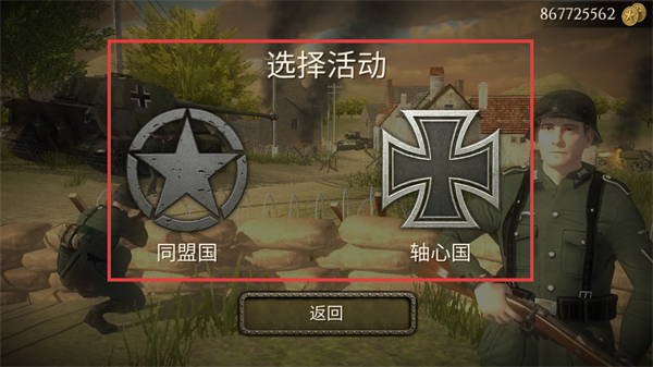 1、在选择活动界面点击同盟国标识,加入同盟国阵营,进入对应阵营的二战战场战斗流程。
