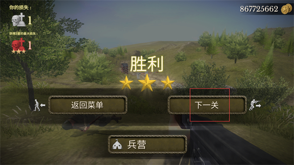 4、战斗胜利后点击下一关按钮,进入下一个战役关卡,继续参与二战战场的战斗任务。
