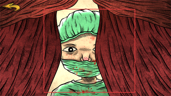 3、点击红色帘幕间露出的医护形象,帘幕会逐渐展开,呈现出后续的场景内容。