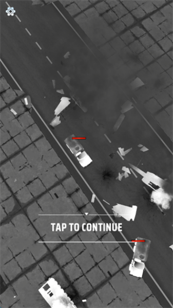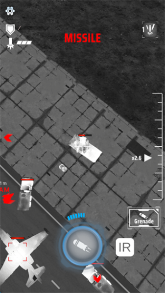 2、熟悉操控逻辑:采用俯视视角,滑动屏幕控制无人机移动,点击锁定按钮锁定目标后点击开火键发起攻击。
