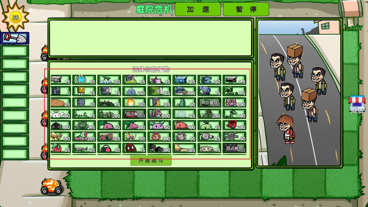 2、在植物选择界面,有多种不同功能的植物可供挑选,查看它们的阳光消耗等信息,选好后点击开始战斗。
