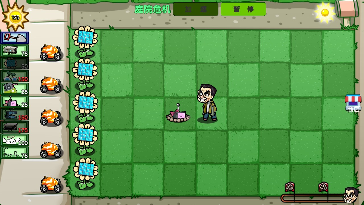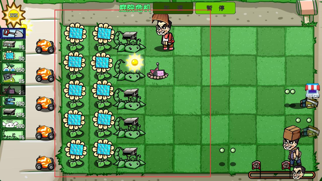 3、战斗时在庭院的格子上种植向日葵等植物,向日葵产生阳光,其他植物可攻击从道路袭来的僵尸。