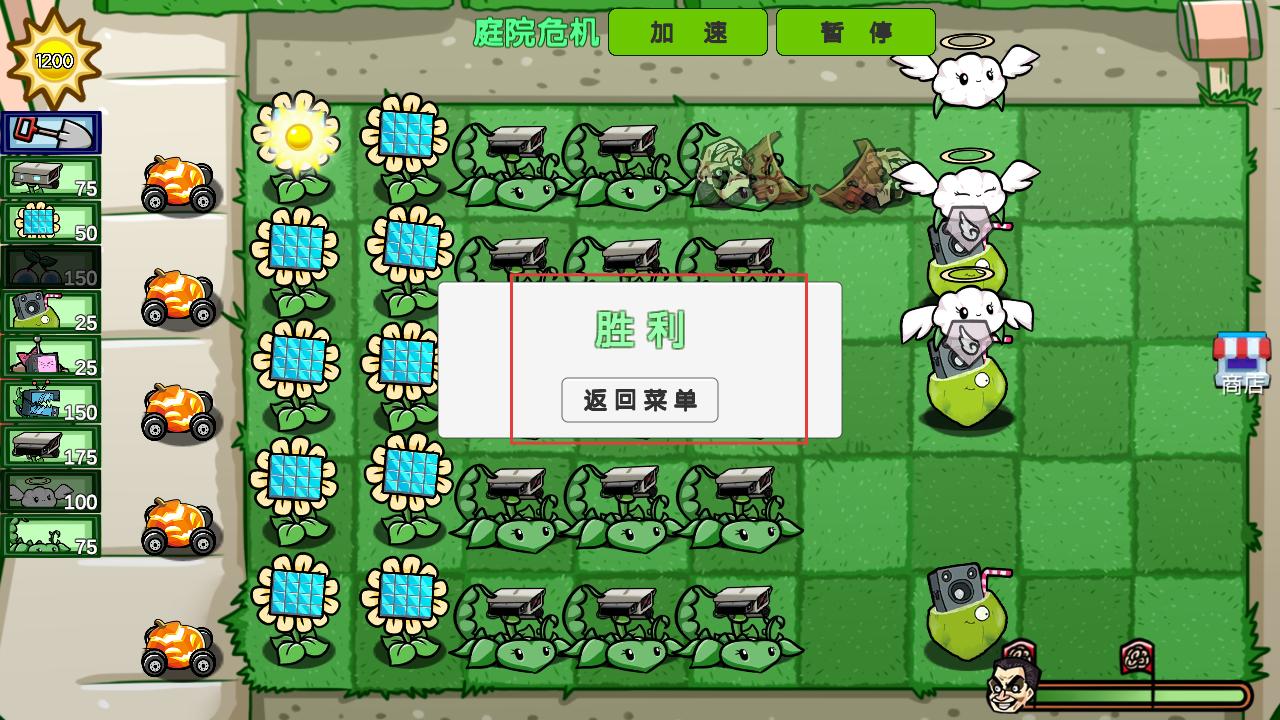 4、成功抵御僵尸进攻后,会出现胜利界面,可点击返回菜单,去选择其他模式或关卡继续游戏。