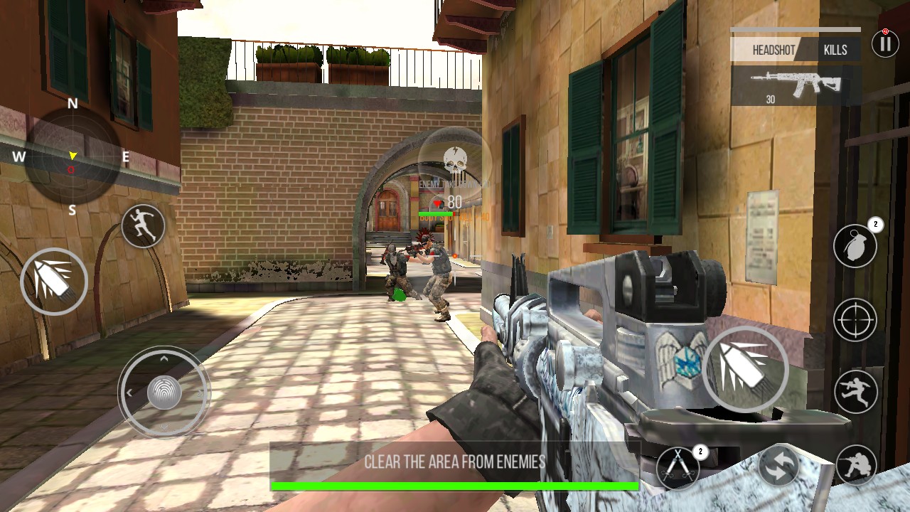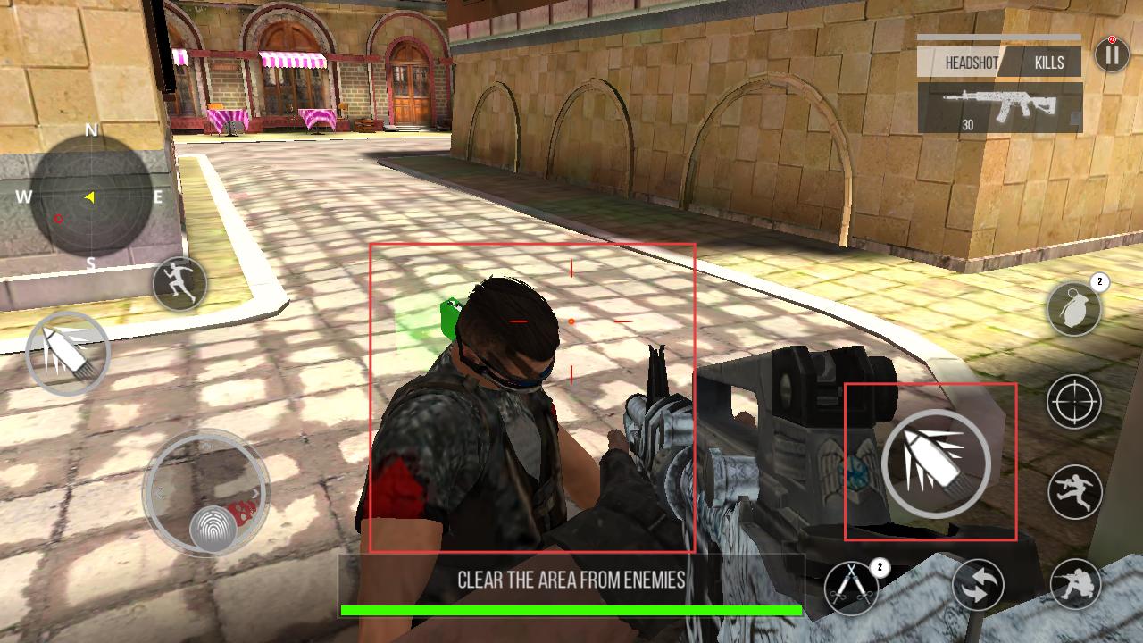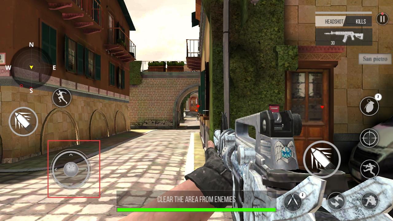 2、在战斗场景中通过左侧操作按钮控制角色移动,手持枪械,寻找敌人位置,准备战斗。