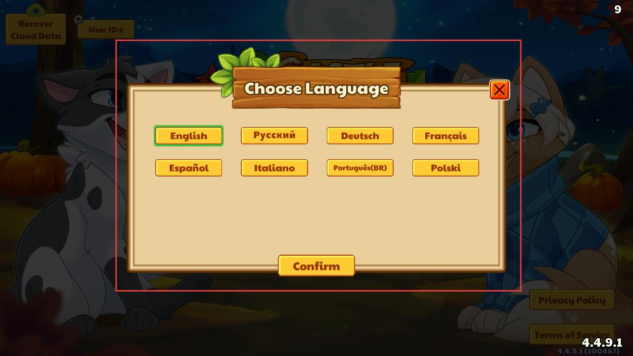 2、点击English按钮,会弹出语言选择窗口,能看到多种语言选项,选择合适语言后点击Confirm,可确定游戏语言设置。
