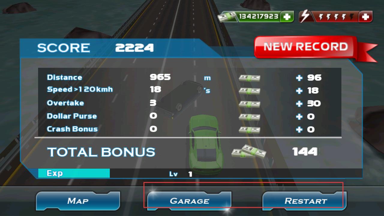 4、一段赛程结束后,会显示得分、行驶距离等信息,此时可点击GARAGE进入车库,或点击RESTART重新开始竞速。