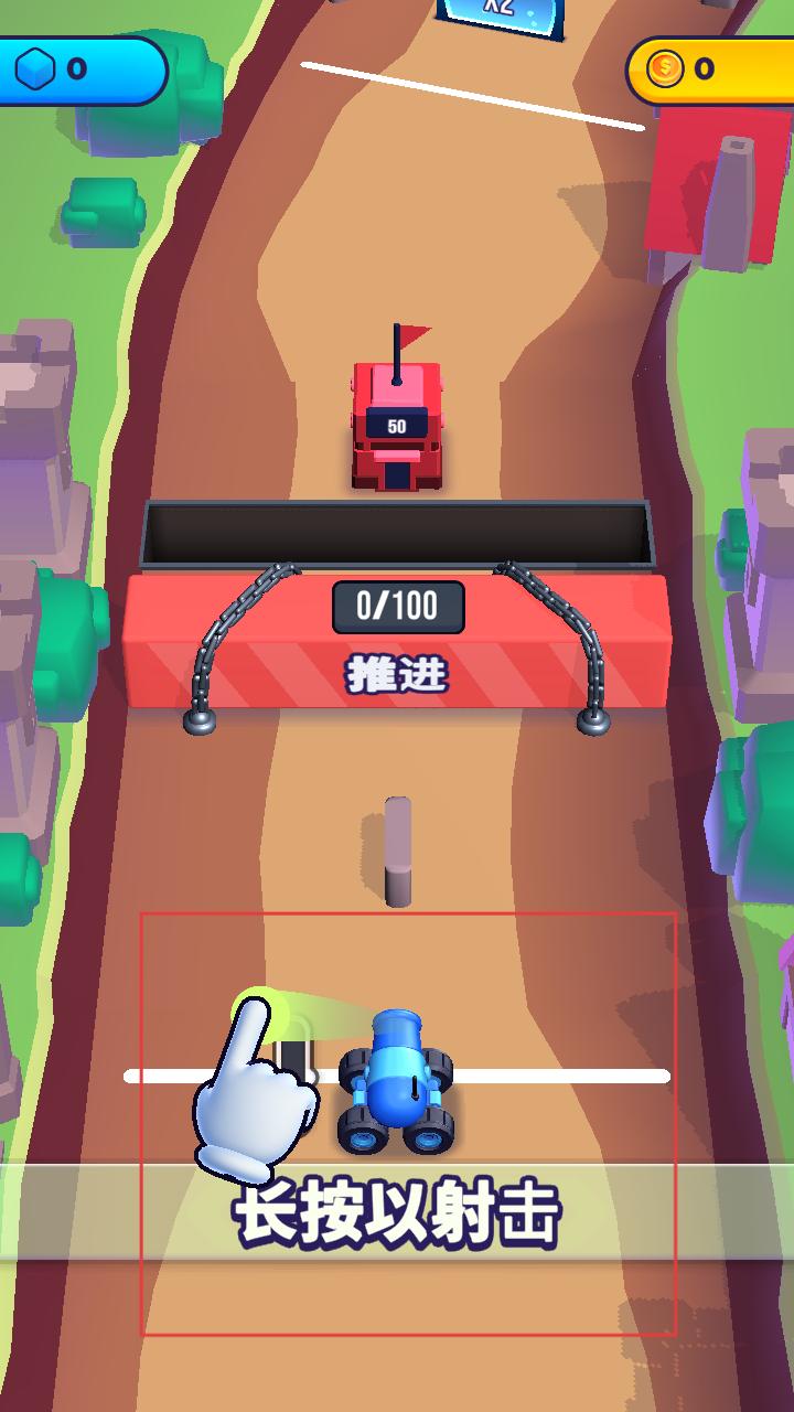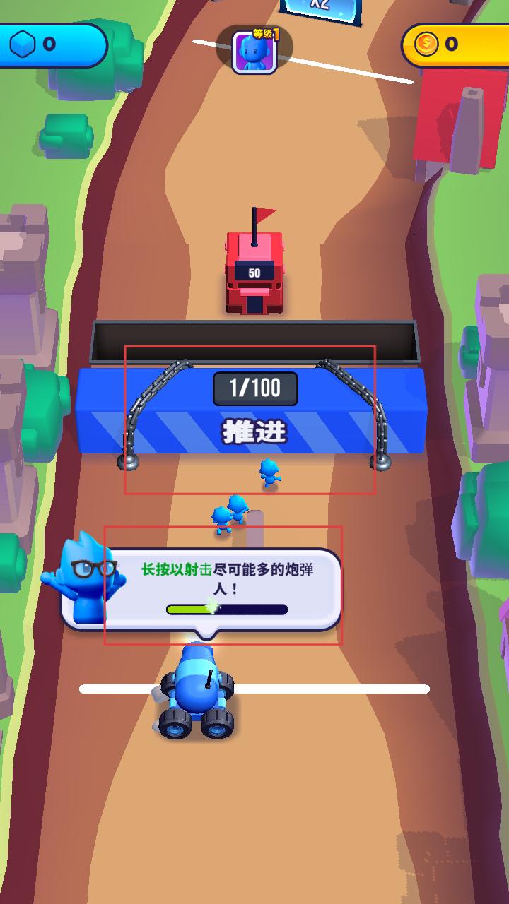 1、进入游戏,操控蓝色载具,按照提示长按,发射出蓝色小人,开始向目标推进,积累推进进度。