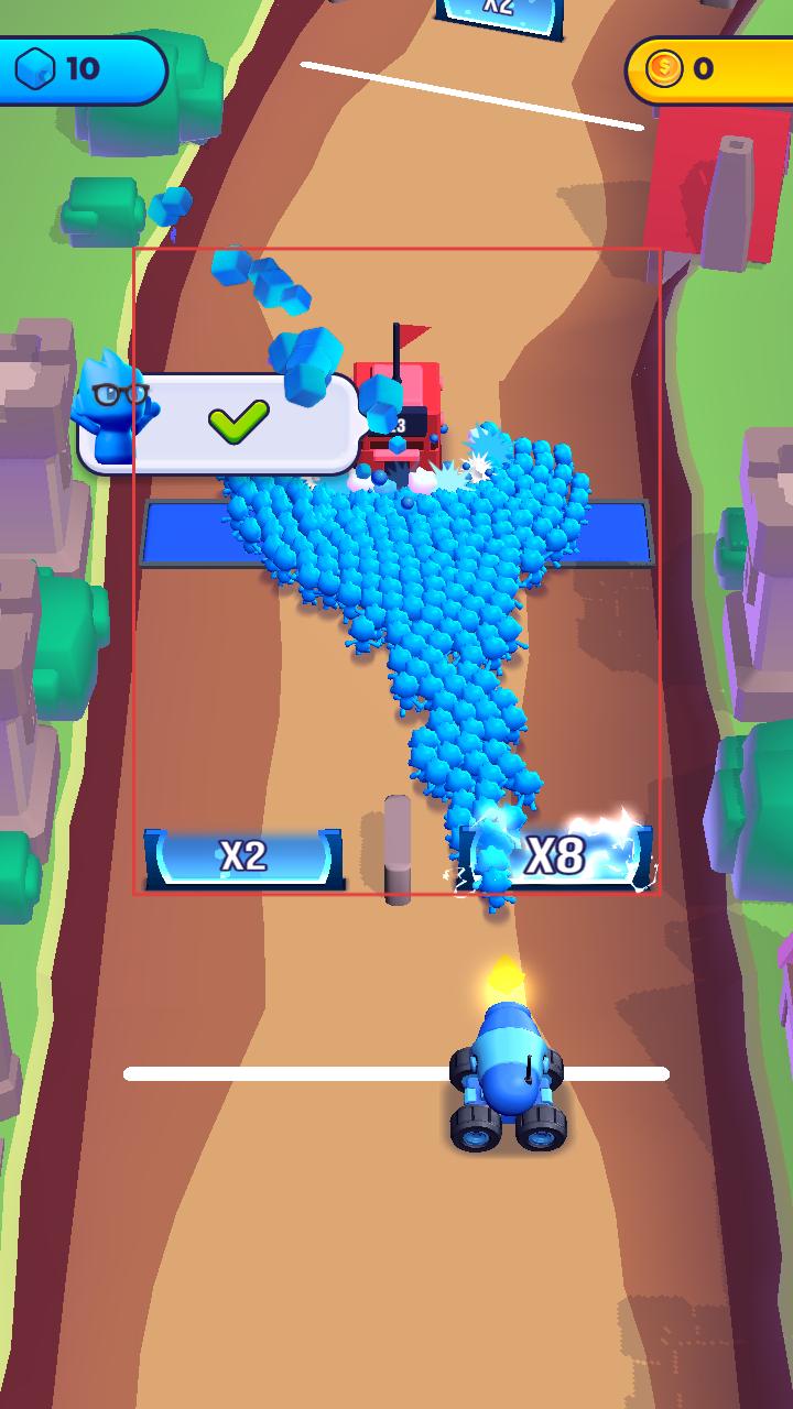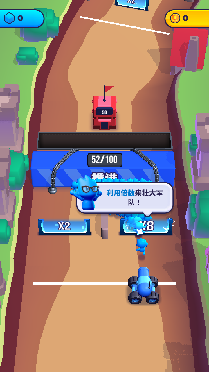3、让蓝色小人通过倍增门,使队伍规模大幅扩大,然后冲向红色目标,展开激烈的群体对抗。