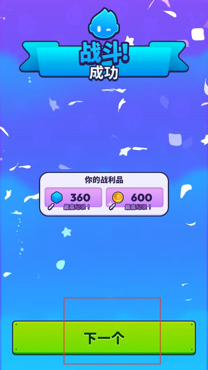 4、成功击败红色目标后,会显示战斗成功的界面,获得战利品,点击下一个按钮,开启新的对战。