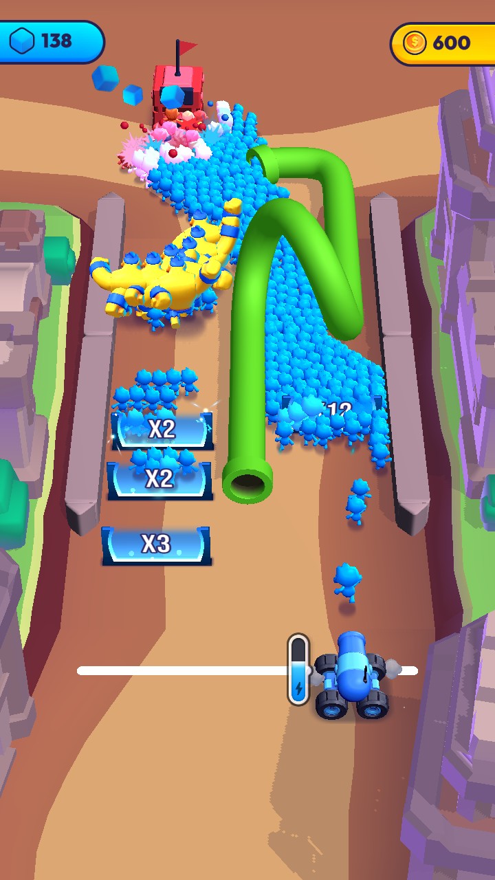 2、持续长按发射更多蓝色小人,看着推进进度不断增加,同时注意利用场景中的元素,助力推进。